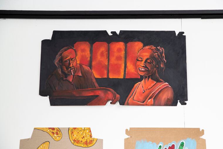 Dave Quaile, the Philly pizza maker known as Freelance, cut up one of Tony’s pizza boxes but used his own box as the basis for the art. The rest of the works are strictly Tony’s boxes.