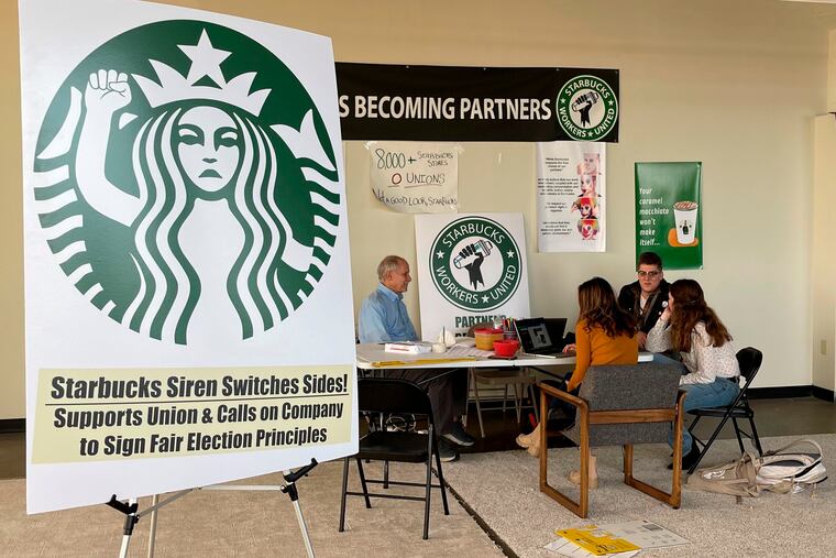 Starbucks workers at two Philadelphia stores took a key step in forming a union last Friday, accelerating a budding labor movement at the coffee giant that has seen employees at dozens of the chain’s locations nationwide try to organize.