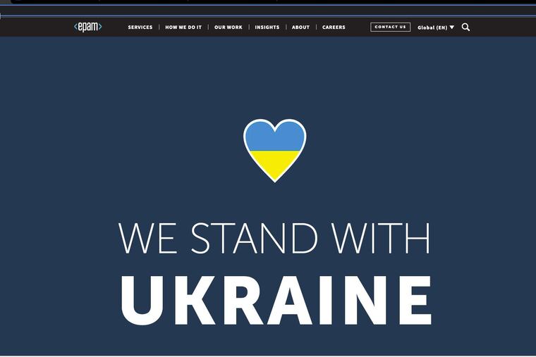 EPAM’s move was accompanied by a bright “We Stand With Ukraine” banner and a heart in the blue-and-yellow colors of the Ukrainian flag on the first page of its English-language web site. That led to its removal late Friday morning from a list of “Companies Supporting War” in Ukraine compiled by the Ukraine-based business-intelligence software firm Molfar, according to chief marketing officer Elena Petukhova.
