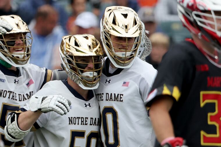 As the final seconds ticked off the Lincoln Financial Field scoreboard, Notre Dame’s bench players streamed onto the field toward their goalie, lacrosse sticks flying in the air.