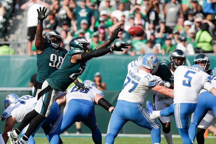 Jenkins, second from the right as the unit lined up, went in untouched and easily blocked the kick. The Lion in front of him had to choose between Jenkins and Avonte Maddox. He chose Maddox.