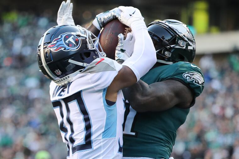 On the Eagles’ first drive in the second half, A.J. Brown has his way again, battling for the ball to haul in a 29-yard touchdown against the Titans on Sunday.