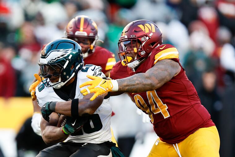 That was a big reason for Washington’s second-half success against the Eagles’ ground game Sunday. Barkley noted in the locker room after the game that the Eagles can’t call the same type of plays, passing or running, with Hurts out of the game. Barkley was tackled at or behind the line of scrimmage six times in the second half Sunday.