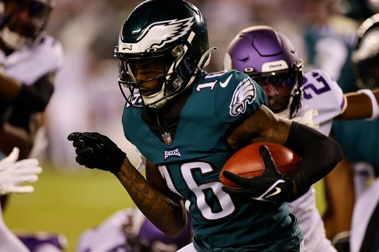 Quez Watkins hauled in a deep pass from Hurts to score a touchdown against the Vikings as Eagles receivers not named A.J. Brown got their share of targets on Monday night.
