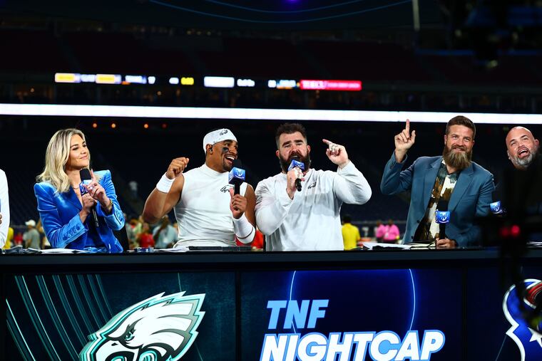 It may be the Eagles’ bye week, but at least one Eagle will be working in football this week. All-Pro center Jason Kelce revealed on Wednesday’s episode of the New Heights podcast that he will be part of Amazon’s Thursday Night Football telecast from Chicago for Bears-Panthers.