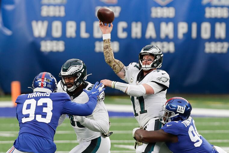 EAST RUTHERFORD, N.J. -- The lighting on the Zoom news conference made it seem as if Carson Wentz had retreated to an underground bunker. Still, it was possible to read surprise on the face of the Eagles quarterback when a questioner mentioned that his team had just gone 0-for-9 on third down in its dreary 27-17 loss to the New York Giants at MetLife Stadium.
