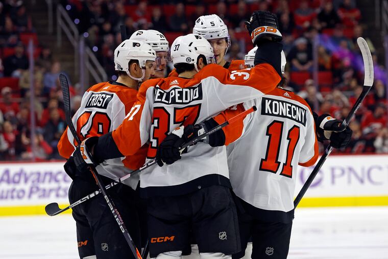 The Flyers now have 23 goals in the opening frame this season, tying the idle Tampa Bay Lightning for the most in the NHL. ... Konecny broke a four-game scoring drought and now has 10 goals this season. He is on pace for 51, which would smash his previous career high of 31, set last season. His goal was exactly what Tortorella had been asking for with him standing on the doorstep and Nick Seeler wheeling off a shot-pass. ... Poehling was moved into a more offensive role alongside Joel Farabee and Scott Laughton and continued to impress his bench boss, who commended his all-around game. It was also his first NHL goal since April 2 with the Penguins — against the Flyers. ... The Hurricanes led 9-3 in high-danger chances through two periods and finished with 11, according to Natural Stat Trick. ... Defensemen Marc Staal and Rasmus Ristolainen look close to returning after each was sporting black jerseys, and not the no-contact yellow sweaters, during morning skate at PNC Arena.