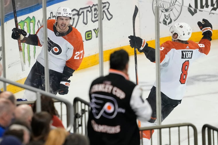 Travis Konecny, who was flying from the puck drop, picked off a pass intended for K’Andre Miller at the point and raced down the ice before pulling up and finding the trailing Flyers defenseman. York zinged it to the post and in for his 10th goal of the season and first since March 2.