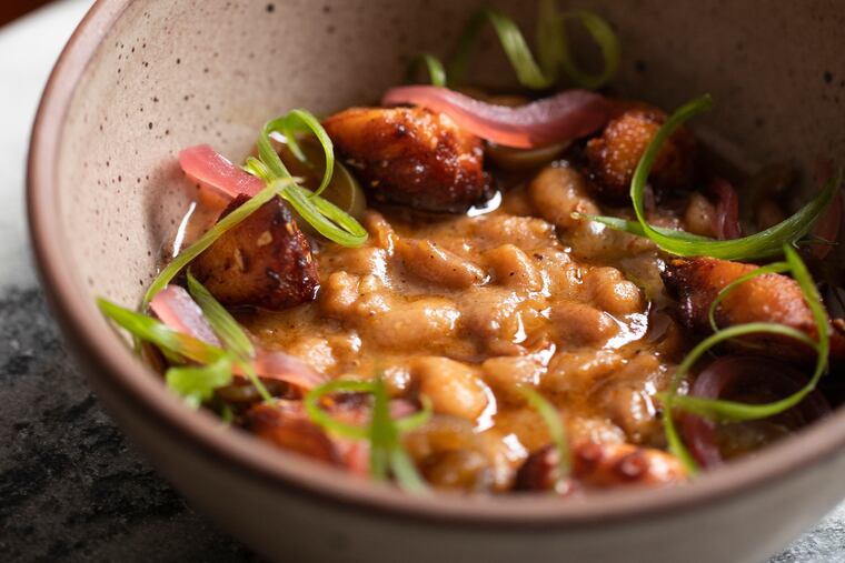 Is Mawn modern Cambodian, with its rib eye updates to the lemongrass-scented beef skewers of the Southeast Asian Market in FDR Park? Is it more pan-Asian, with its Burmese ginger salad and Thai-style “all-star seafood rice” jeweled with uni, crab, and roe? Or is it Jewish fusion, channeling the marriage of owners Phila and Rachel Lorn into a soulful chicken soup mash-up of schmaltzy matzo ball broth and pho? Lorn, named Phila as a tribute to the city where his Cambodian parents settled as refugees, defines the cuisine of this freewheeling “noodle shop with no rules” as the sum of his own experiences as a first-generation South Philadelphian: “We’re authentic in the way we cook the food I ate growing up — and what I want to eat now.” That independent streak has made this spirited 28-seat Bella Vista BYOB one of the toughest reservations in town.