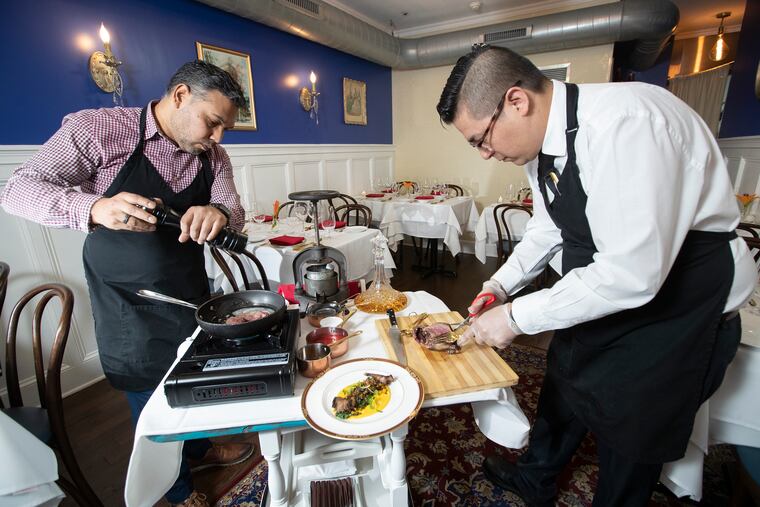 Of course, when it comes time to flambé, it’s a tight squeeze in this dollhouse of a room, which explains why the tableside shows stop on busy weekends. Cusack, who spent time saving for the project while private-cheffing for Sixers star Joel Embiid, designed the royal blue-and-white room himself with carpentry help from his brother and father (both pro tradesmen). They did their best to dampen the sound challenges with wainscoting, plus linens for the table and a large rug. But it can only help so much when this space is at capacity and flowing with some of the guests’ collector-grade wines.