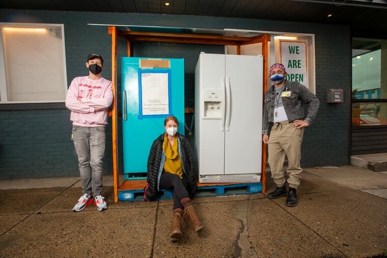 In Point Breeze, outside Community bar at 21st and Federal Streets, a colorfully painted fridge contained bagged sandwiches, matzo, heads of cabbage and cauliflower, carrots, and a slew of prepared meals from Rowhouse Grocery. Cartons of blueberries chilled in the freezer. A passerby spied the contents inside and stopped to take a tray of spaghetti squash-and-vegetable stew for dinner.