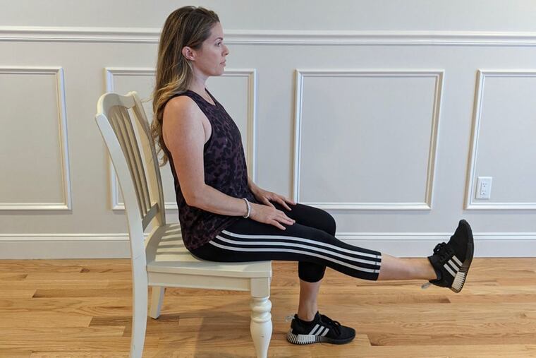 Keep your left foot flat on the floor as you elevate your right lower leg straight out. Your moving leg should have a flexed ankle throughout, while your thigh stays firm against the seat.