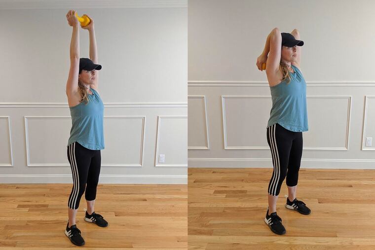 Bend at your elbows to lower the weight behind your head, then bring the weight back to the extended overhead position. Avoid this improper form by securing your elbows close to your ears throughout the entire exercise.