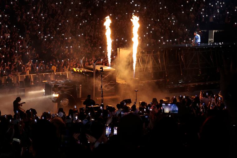 Performing his set atop a black semi-trailer truck, Bad Bunny turned a sold-out Wells Fargo Center into a marquesina party on Wednesday night in Philadelphia during his show in support of his third studio album El Último Tour del Mundo.