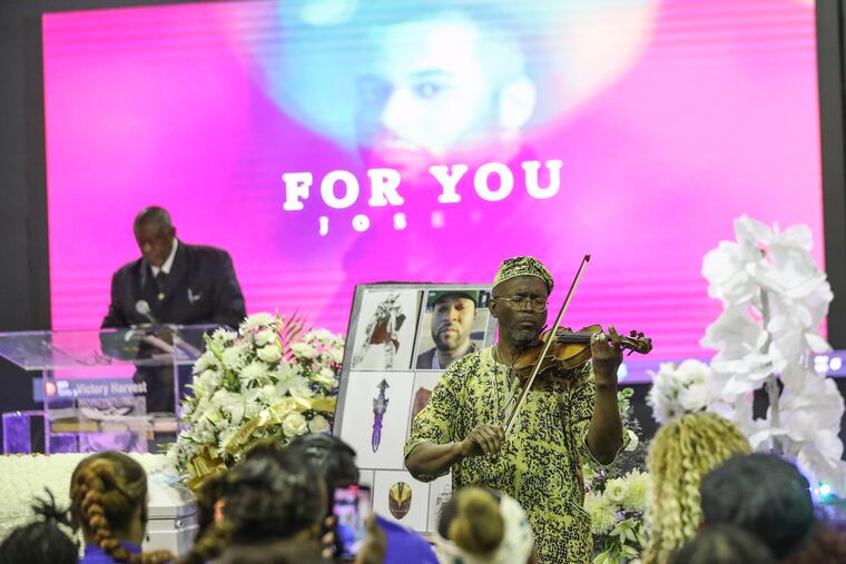 Joseph Wamah Jr.’s white casket, draped in a pall made of white and gold roses, lay in front of the stage at Victory Harvest Fellowship International Church in Southwest Philadelphia on Saturday morning, where mourners gathered to celebrate the life of the first victim of last month’s Kingsessing mass shooting.