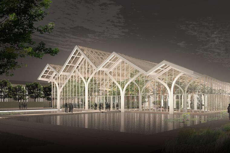The new conservatory will consist of a 32,000-square-foot glass house rising in a series of asymmetrical peaks and seeming to float on a shimmering pool of water. The architect is Weiss/Manfredi, with gardens and pools designed by Reed Hilderbrand.