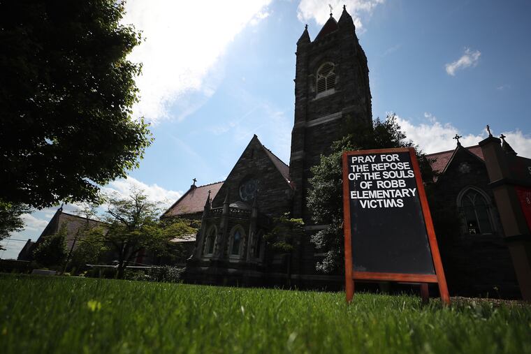 On the church grounds of St. Martin-in-the-Fields in Chestnut Hill, a sign prominently displays encouraging messages of support and calls for prayer during holidays and major events throughout the year. This past week, it called for prayers to the victims of Robb Elementary School.
