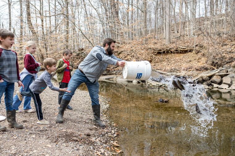 Then, with a “here we go,” he tossed the bucketful of fish into a stretch of Unami Creek in Quakertown, Bucks County. One large golden trout, a bright color morph of the rainbow trout, swam in circles in a deep hole on the creek.