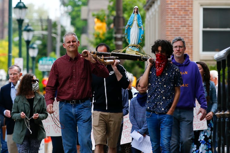 Parishioners carrying a statue of the Virgin Mary staged a protest outside the Cathedral Basilica of SS. Peter and Paul on Sunday, urging Archbishop Nelson Pérez to resume public Masses across the Philadelphia area.