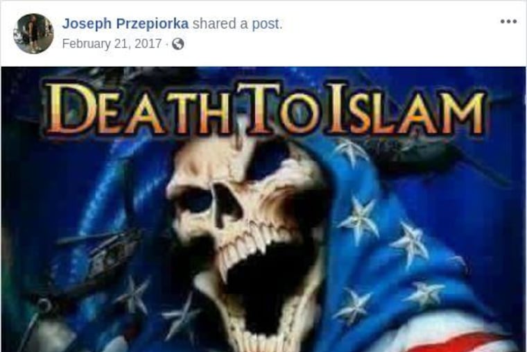 Feb. 21, 2017: Sgt. Joseph Przepiorka allegedly posts an image of a skeleton wrapped in a U.S. flag, carrying a gun, and the words Death To Islam on top. The Plain View Project cited 91 questionable posts by Przepiorka, of which 56 were categorized as showing bias.