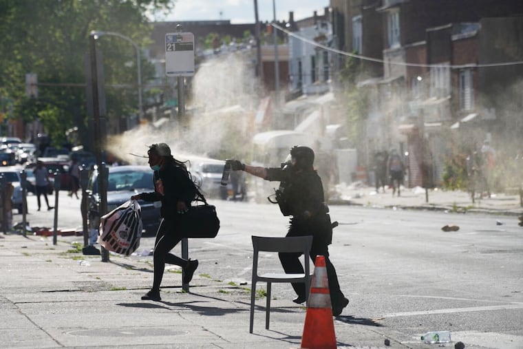 At 52nd and Chestnut, looters climbed a trashed police cruiser to break into a Foot Locker store. A few blocks away, at Arch Street, two police vehicles smoldered. Tear gas fired from a police SWAT vehicle fogged the street.