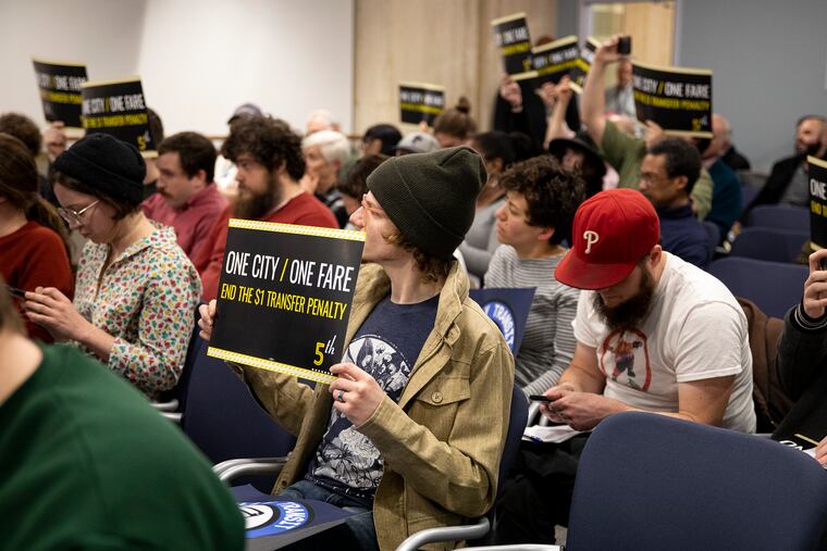 Representatives of 5th Square, an urbanist political action committee, and the Philly Transit Riders Union, some holding signs reading “One City/One Fare,” told the board that transfer fees are an unfair burden.