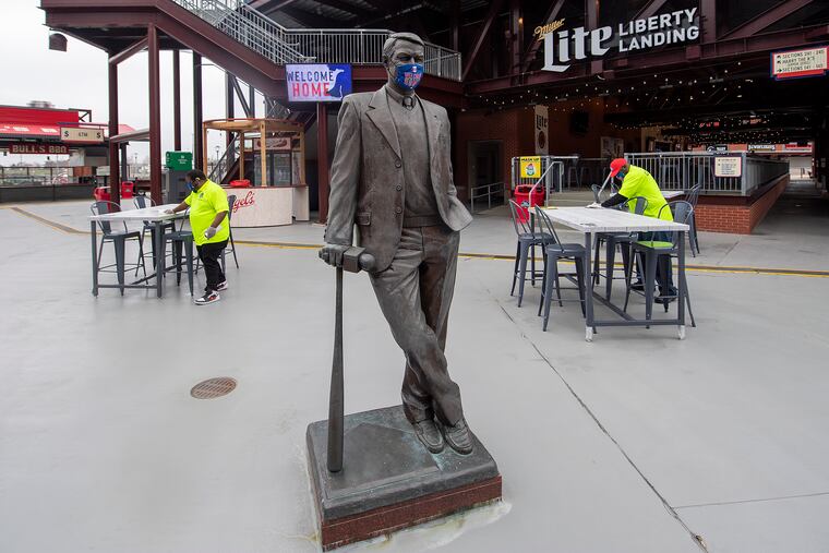 A statue of Harry Kalas wears a face mask during a tour on the COVID-19 protocols and enhanced safety guidelines that fans should be aware of when they return to Philadelphia Phillies baseball games at Citizens Bank Park.Read moreJOSE F. MORENO / Staff Photographer
