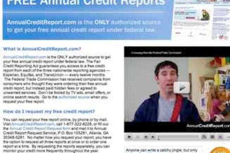 The FTC's videos, unveiled yesterday, promote the genuine free-credit-report Web site - www.annualcreditreport.com - that Experian and its two main competitors have been required to operate since 2005. (To see the FTC videos, go to www.ftc.gov/freereports.)