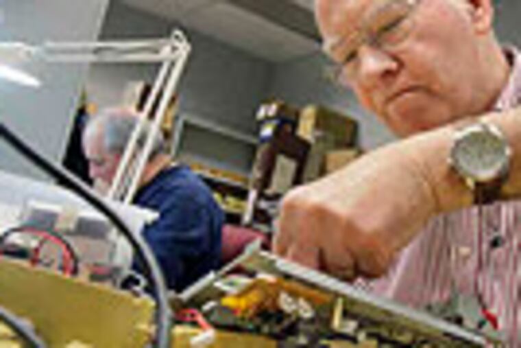 The local "talking book" repair chapter was created in 1989. Many of the workbenches and repair tools have come from shuttered GE facilities throughout the region, said David Blake, 82, of Broomall, as he glued a part onto a cassette machine.