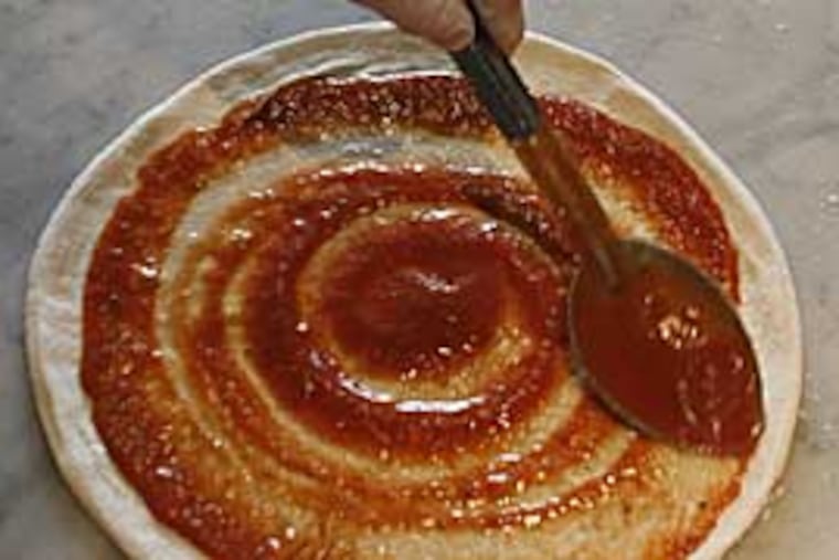 Michaud dispenses a large kitchen spoon-and-a-half of the tomato sauce in the middle of the pie and swirls it around with the backside of the spoon.