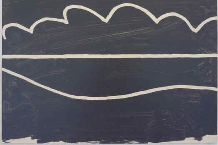 Thinking back to Guernica, Picasso's visceral condemnation of the bombing of the Basque town of Guernica during the Spanish Civil War, Nakazato, a colorist of many years' standing, decided on a black-and-white palette for the 30 panel paintings and six monoprints that make up Hiroshima Revisited. His small paintings - which are mounted in grid formations and in which wide, transparent strokes of matte black acrylic are intercepted by white outlines of vaguely familiar, recurring shapes (a periscope, a magnifying glass, a wave) - also bring film cels to mind. The monoprints, in the front of the gallery, comprise complex arrangements of shapes and suggest scroll paintings and banners.
