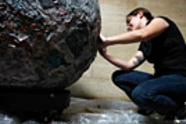A four-foot sphere of newspaper will come rolling through Philadelphia Saturday, headlining its Italian creator's shows at the Art Museum.