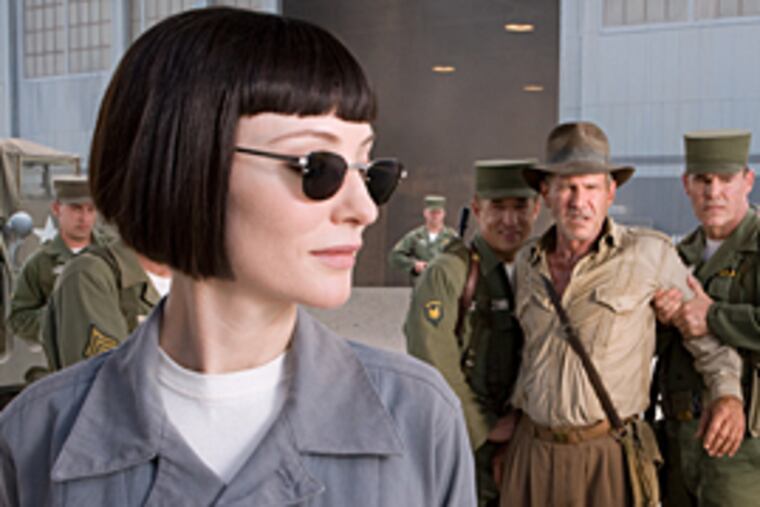There is no place in the future for the snap brim hat. Even the villains are new - out with the Nazis, in with the Cold War and the KGB. A Russian agent (Cate Blanchett, drawing her accent from Natasha in "Rocky and Bullwinkle") has kidnapped Indy, and forced him to provide the location of a mysterious mummy stored in a government warehouse (the same one, by the looks of things, that houses the Ark of the Covenant).