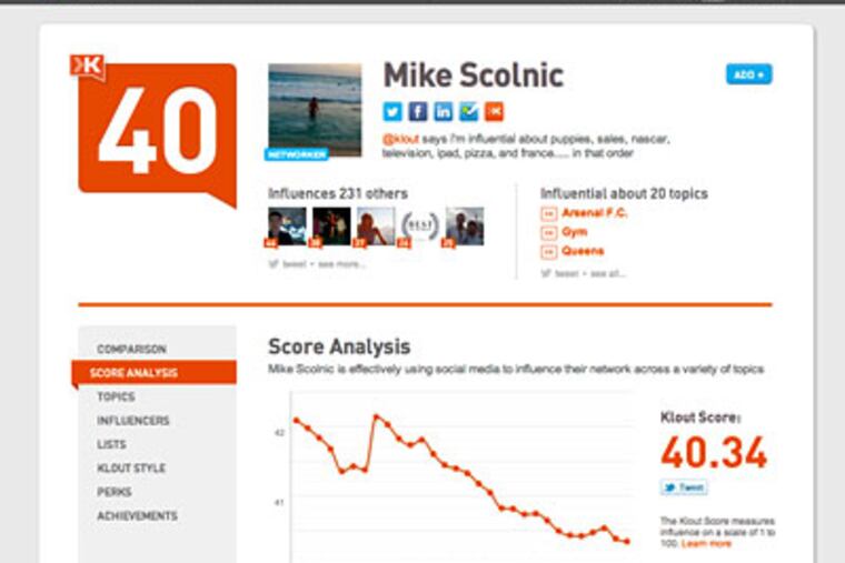 And not always on target. Michael Scolnic, 23, a Citigroup analyst and Wynnewood transplant who lives in Manhattan, has a Klout score in the 40s. His top five topics of expertise — gleaned from the frequency of certain words in his public online content — are listed as Arsenal F.C., Gym, Queens, Torah, Moms, Lisbon.