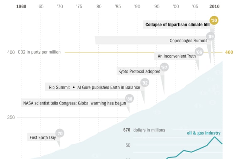 To provide some perspective on why that might be, Sunlight has overlaid data we keep onto the Mauna Loa graphic. Fossil fuels, which produce carbon dioxide and other gases implicated in global warming, are a big part of the influence industry in Washington. Our records, which start in 1989, show that campaign donations by the oil and gas industry reached a peak in 2010 -- the same year as the collapse of the last major effort to reach a bipartisan deal on reducing emissions of carbon dioxide and other gases implicated in global warming.