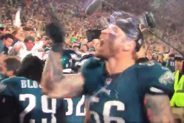 After the play, Graham and other Eagles defenders jumped into the stands to celebrate with a crowd dominated by Birds fans. Unfortunately, Long's jump into the stands was rejected by three Rams fans, who immediately pushed him back onto the field.