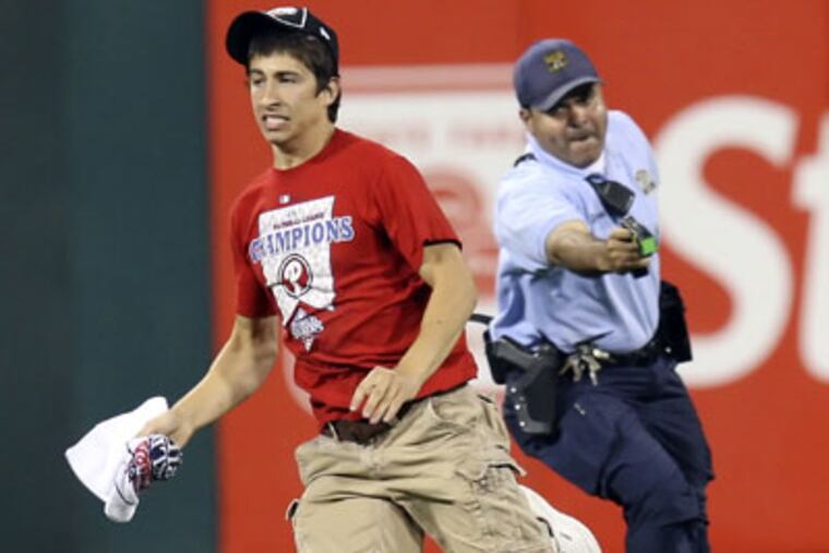 For the first time in Phillies history, a fan running on the field at Citizens Bank Park was subdued by a Philadelphia police officer using his Taser gun.
