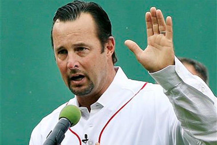 The retired righthander wiped away tears during a pregame ceremony that honored him for his play and for his charitable work, which earned him the Roberto Clemente Award in 2010.