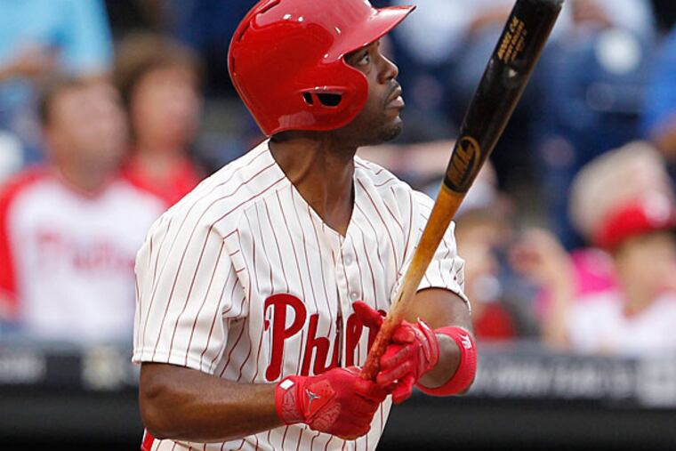 With a lead-off double during the ninth inning, Jimmy Rollins recorded his 2,234th hit in a Phillies uniform, tying Mike Schmidt for the most in franchise history.
