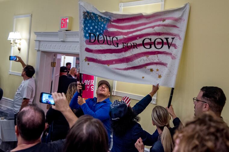 GOP gubernatorial candidate Doug Mastriano appears before a standing-room-only crowd at Galdo's catering hall in South Philadelphia.