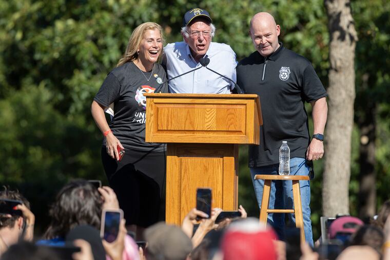 The U.S. Senator from Vermont, Bernie Sanders took the stage at a rally in support for workers with Sara Nelson, head of the Association of Flight Attendants, and Sean O'Brien, President of the International Brotherhood of Teamsters, on Aug. 20, 2022.