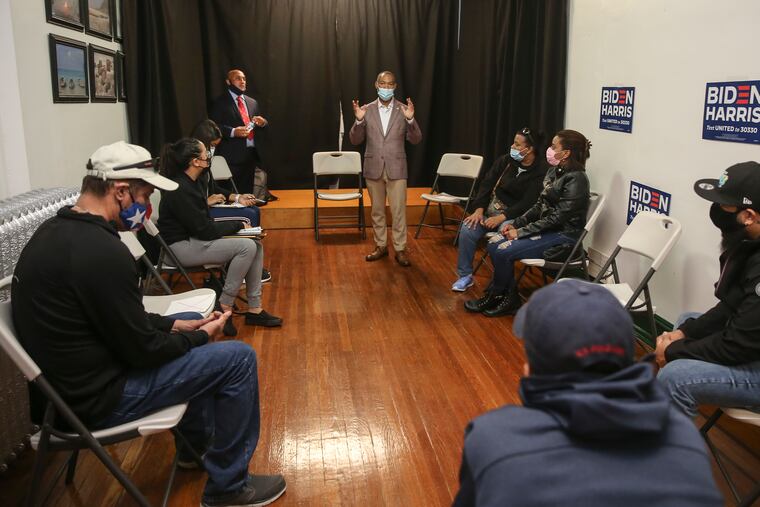 ALLENTOWN — A handwritten “Latinos For Biden” sign directed about a dozen people into the campaign’s newly opened office in Allentown on Tuesday night. Julio Guridy greeted people at the door with a smile, thanked them for coming, and asked them to please keep their masks on and stay spaced out once inside.
