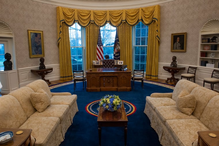 The furniture was switched out on Inauguration Day, an aide said. During a tour a reporter was asked to avoid stepping on the freshly vacuumed rug so that it would be in pristine condition when Biden arrives. Seeing a fleck of dirt on the rug, one aide stooped down to remove it.