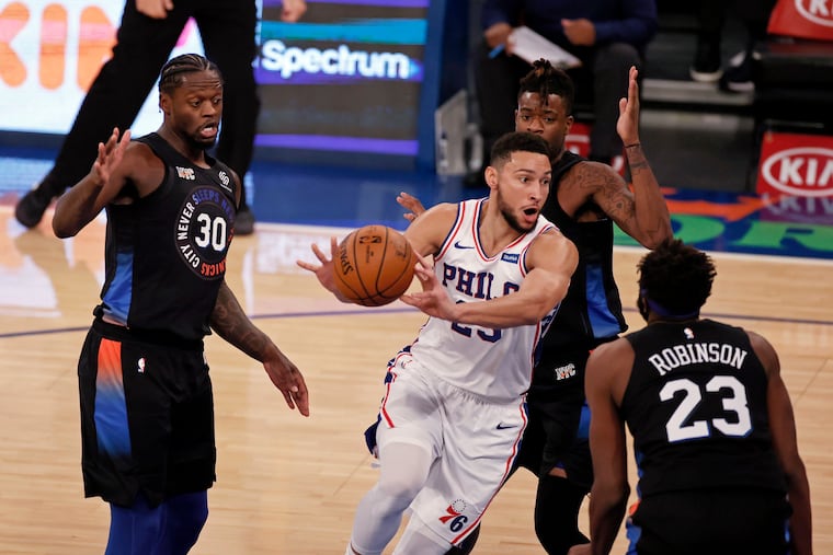 On this play, Julius Randle, with Tobias Harris guarding him, got to the basket and scored thanks to an accidental pick by Simmons.