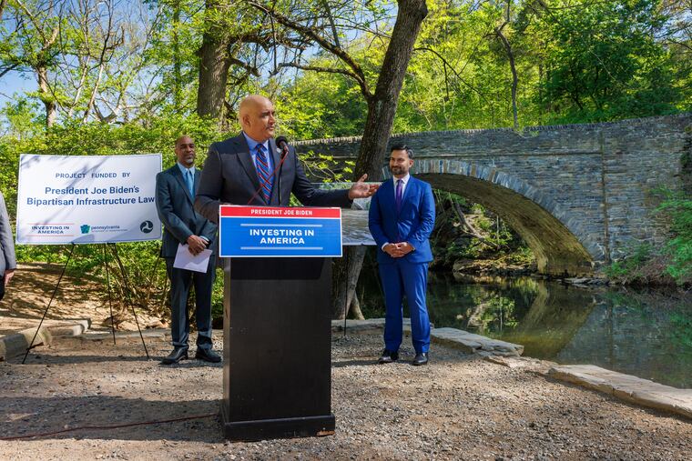 He and Ali Zaidi, the White House climate adviser, celebrated the funding from the 2021 bipartisan infrastructure act, to the musical accompaniment of Canada geese and wood ducks near the Valley Green Road Bridge.