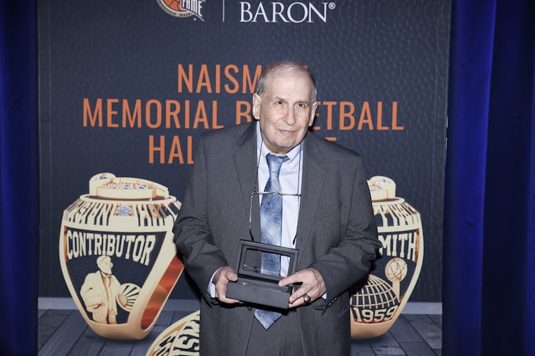 Former Inquirer writer Mel Greenberg accepts Hall of Fame’s Curt Gowdy Award for his coverage of women’s basketball