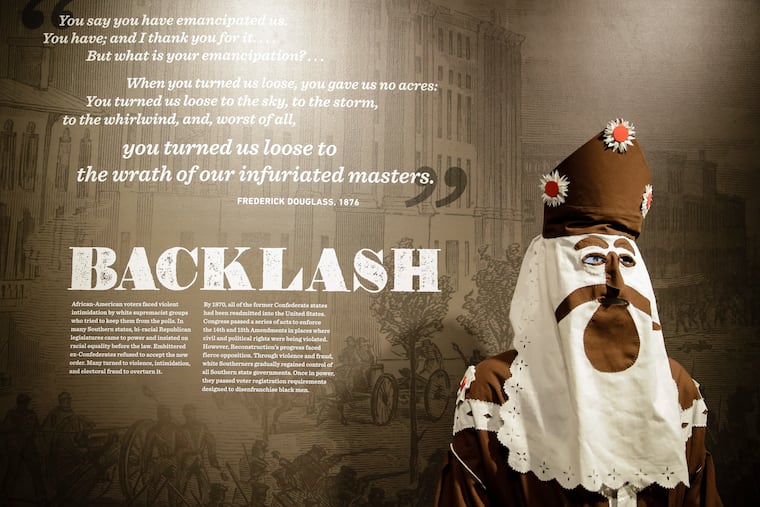 At the National Constitution Center, visitors at the end of their journey through the ups and downs of the post-Civil War amendments are confronted with the word “BACKLASH” and the surreal and grim figure of a real-life KKK white costume and hood from 1866. It’s a haunting specter of what can go wrong — in 1877 or 2019 — when bad people are determined and when good people are too worn down to do the right thing.