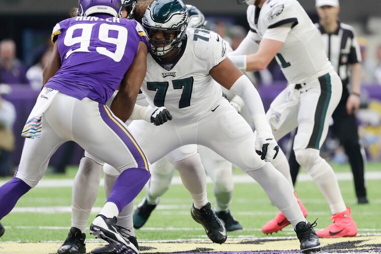 Peters left for the first time after the Eagles’ 10th offensive play. He appeared to tweak his knee when he kicked out during a Miles Sanders 3-yard rush. Dillard (No. 77) jumped in on second down and Vikings defensive end Everson Griffen (No. 97) drove him back. He was already off balance when he appeared to trip on running back Jordan Howard (No. 24) and fell backward.