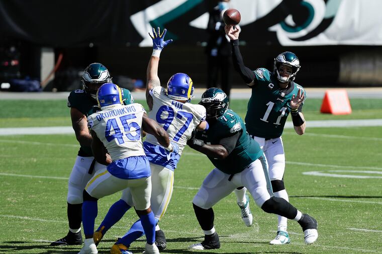 One of Wentz’s most costly mistakes came in the third quarter when he threw an inadvisable pass to JJ Arcega-Whiteside, trying to beat double coverage, but was intercepted by Rams corner Darious Williams. The Eagles trailed by five points at the time, but the Rams scored on the ensuing drive en route to a 37-19 win.