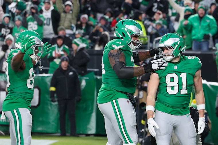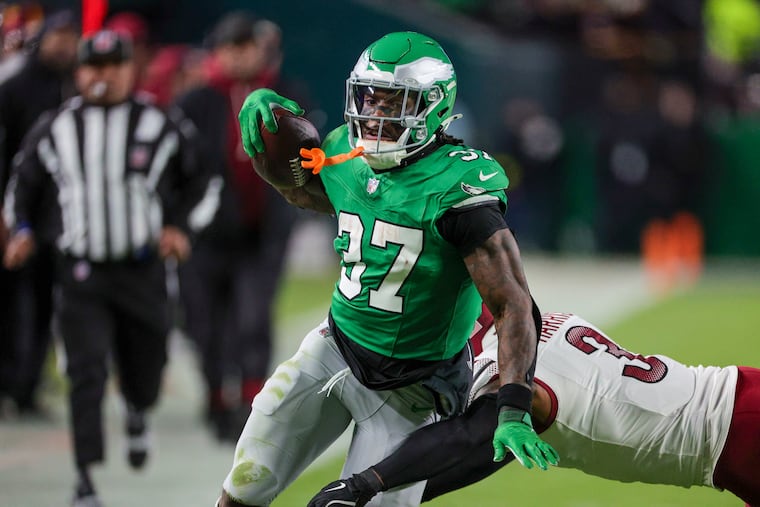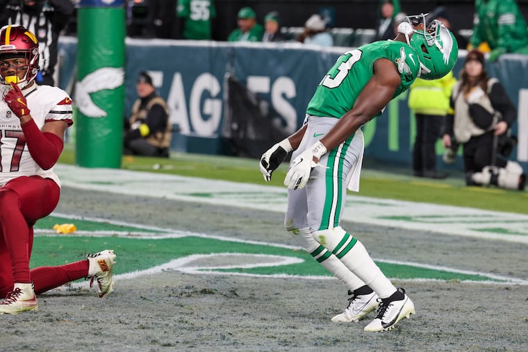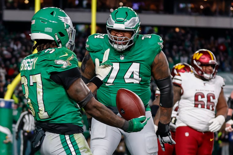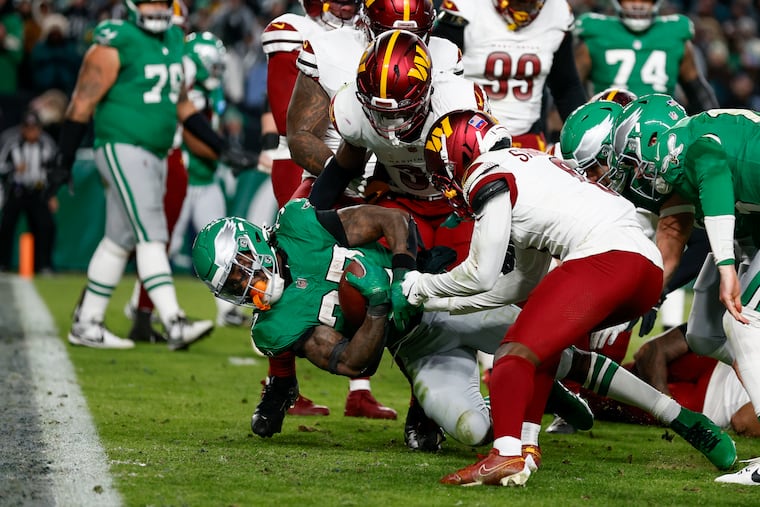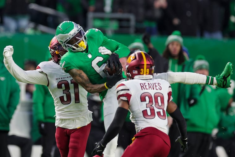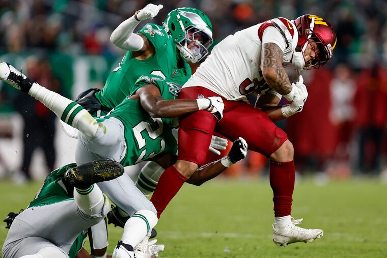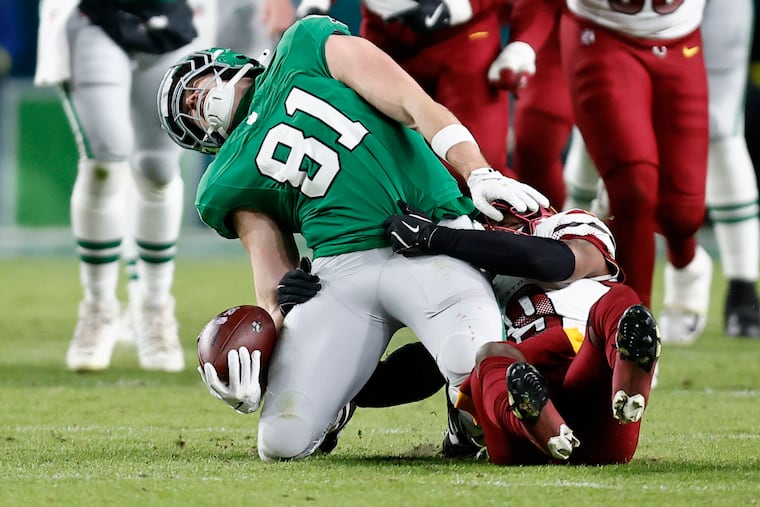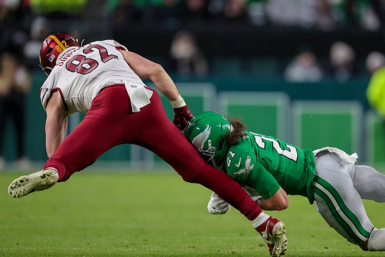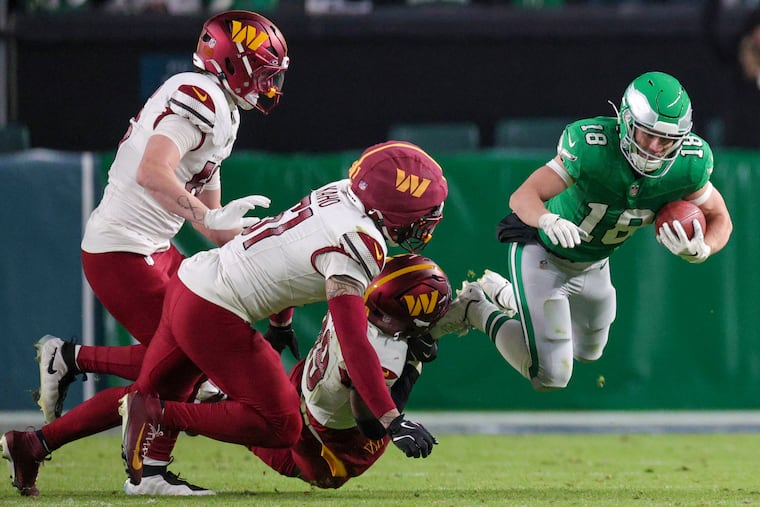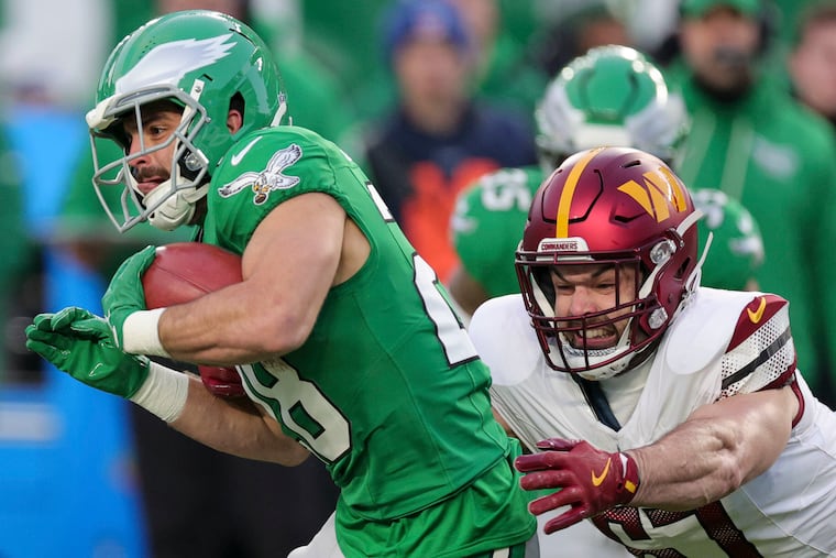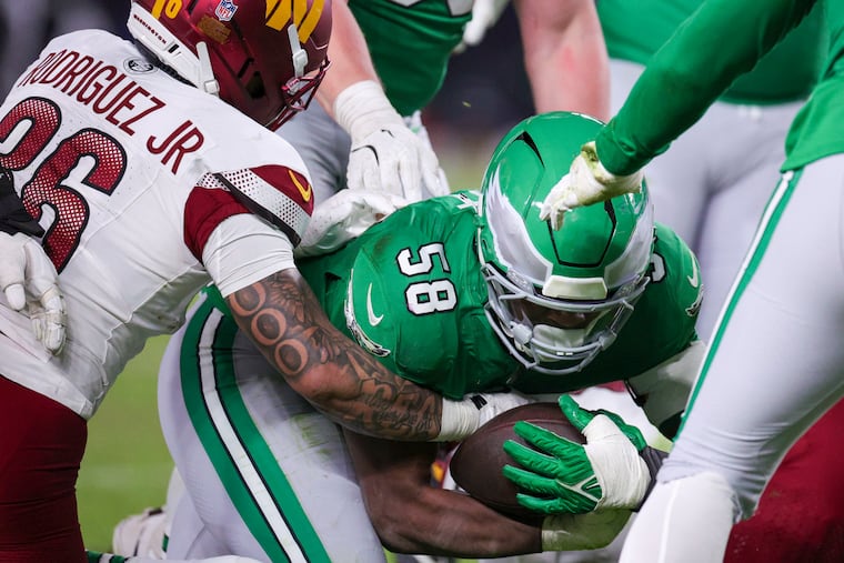 Tight end Grant Calcaterra scored the Eagles’ first touchdown when he snagged a 15-yard pass. He squared up Commanders linebacker Frankie Luvu on Bigsby’s 11-yard outside run in the third quarter. Calcaterra left in the third quarter with ankle and knee injuries when he was dragged down by Reaves.